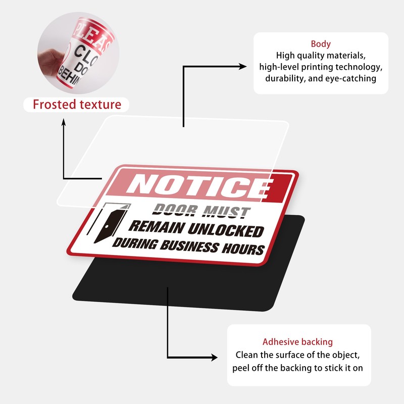 - 【PACKAGING CONTENT】: You will receive 2pcs classical this door to remain unlocked during business hours sign,which comes with an adhesive backing and is very convenient to use. This business hours door sign measures 9x5.9 inches. Different from ordinary stickers, the surface is a delicate matte with a certain thickness.