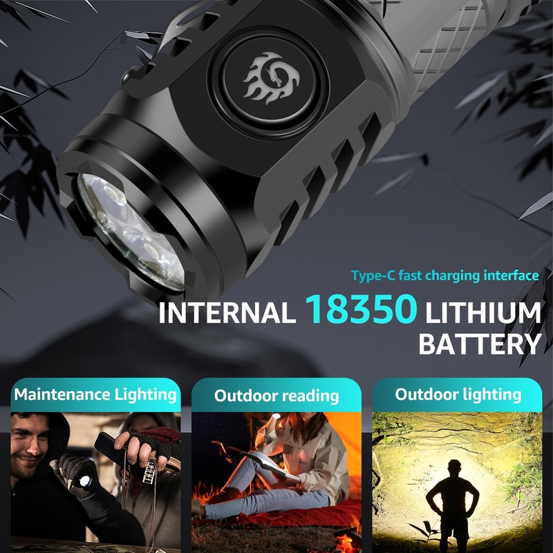 - [USB Rechargeable] The mini torch is powered by an internal 18350 Li-ion battery that provides powerful and brightness.Type-C charging port ensures fast charging and the built-in smart chip protects the battery for durability.