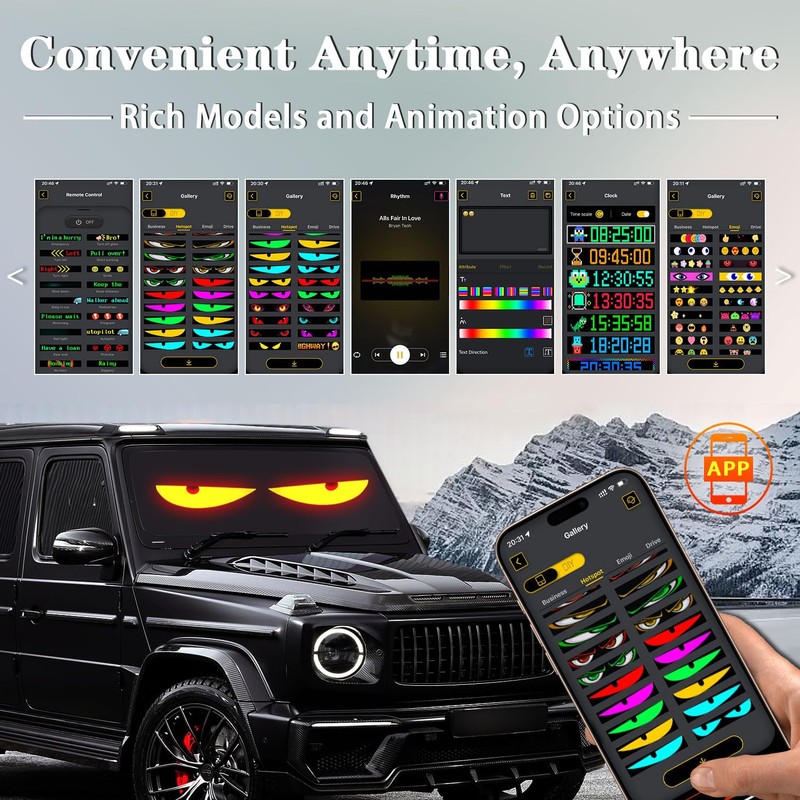 - 【Customizable Flexible LED Display】Get creative with our mobile APP! Display text, patterns, doodles, animations, or even your own logo. Transform your LED windshield eyes into a moving piece of digital art in just a few taps