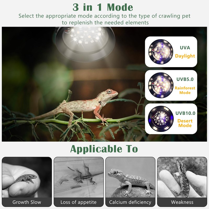 - 【3 Lighting Modes】The output of our LED UVB reptile light is more efficient than normal UVA UVB light bulbs. 3 unique lighting modes: 1. UVA full-spectrum daylight mode(not contain any UVB rays, suitable for most reptiles. Such as snakes, chameleons and lizards); 2. UVB5.0 mode (for rainforest habitats reptiles, such as tree frogs); 3. UVB10.0 mode (for desert habitats reptiles, such as desert geckos), meeting your diverse reptile pet lighting needs