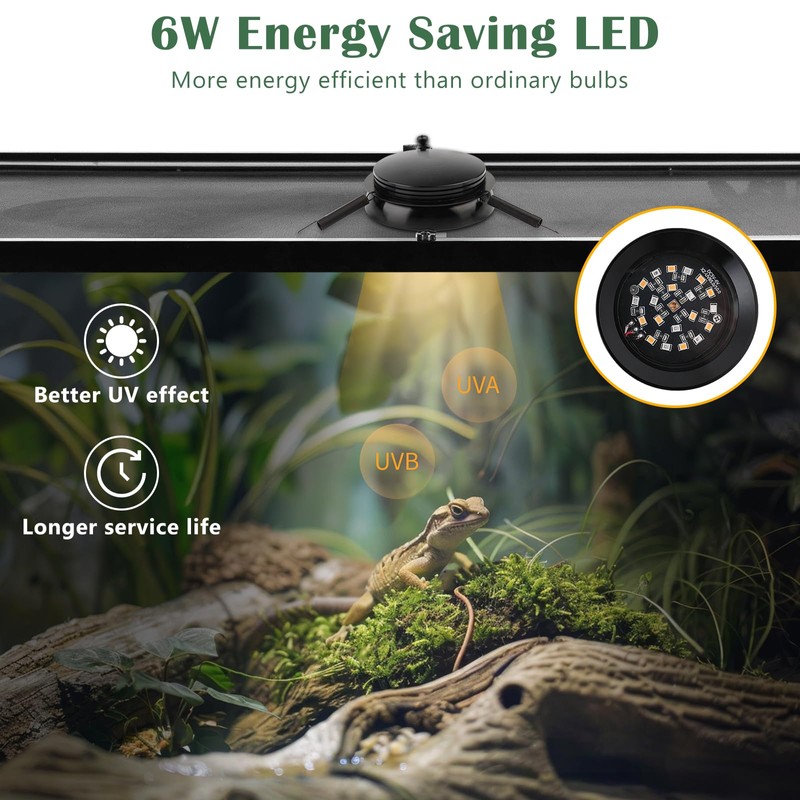 - 【UV & Energy Saving】This UVB & UVA reptile light adopts advanced low power consumption 6 watt super bright LED technology, which is equivalent to a 100W incandescent lamp! It not only produces better UV effects, but also has a longer lifespan, saving you money on your electricity bill while being more environmentally friendly. NOTE: Please kindly note that the UVB reptile light does NOT provide heat for reptiles to keep warm