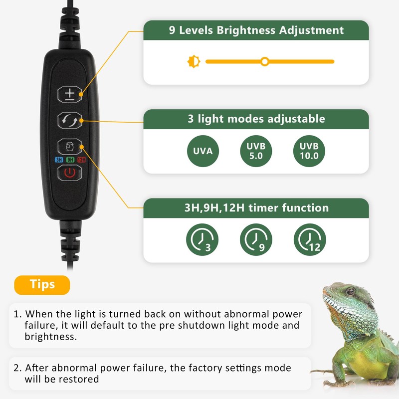 - 【9 Levels Adjustable Brightness】9 adjustable brightness settings of the UVB light for reptiles, as if creating a perfect daily environment for your crawling pet. Whether it's daytime, nighttime or sunset, you can make your pet feel the most natural light environment with simple adjustments, making your reptile pet feel as if it's in nature