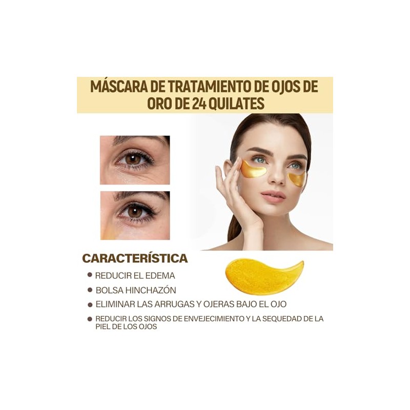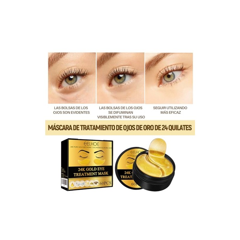 - Acerca de este artículo TRATAMIENTO PREMIUM: Parches para ojos con oro 24K y colágeno que ayudan a reducir la apariencia de ojeras y líneas finas HIDRATACIÓN INTENSA: Fórmula enriquecida con ácido hialurónico que proporciona hidratación profunda al contorno de los ojos CANTIDAD GENEROSA: Incluye 60 pares de parches para ojos, suficientes para un tratamiento prolongado APLICACIÓN SENCILLA: Parches de gel que se adhieren suavemente a la piel y son cómodos de usar durante 15