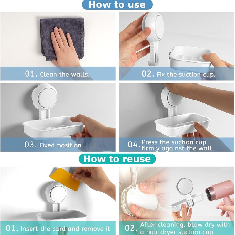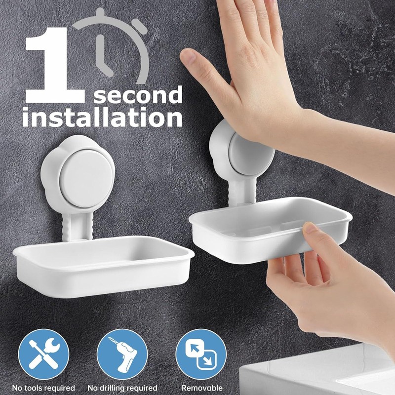 - 【Hassle-Free Installation】 Simply press down the suction soap dish for shower to squeeze the air out, they will stick to the wall firmly. You can finish the installation in 1 second. No screws, no nails, no glue, no tools. Can be re-positioned many times and removed without leaving residues.