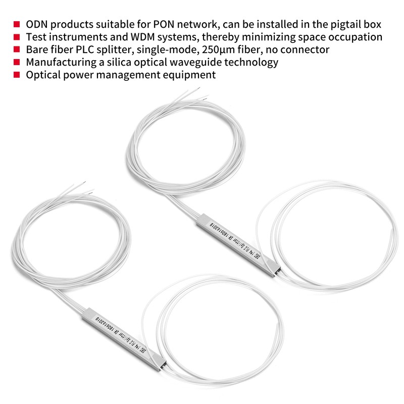 1、This bare fiber PLC splitter, single-mode, 250μm fiber, no connector, convenient and practical. 2、PLC splitter is a kind of optical power management equipment, manufactured using silicon dioxide optical waveguide technology. 3、Used to distribute the optical signal from the central office (CO) to multiple locations. 4、The bare fiber splitter is an ODN product suitable for PON networks, which can be installed in pigtail boxes, test instruments and WDM systems, thereby minimizing space occupation. 5、This fiber splitter is relatively fragile in terms of fiber protection, and a comprehensive protection design for the handling box and equipment is required.