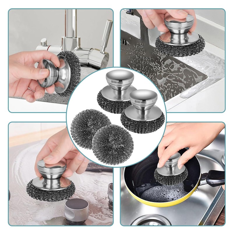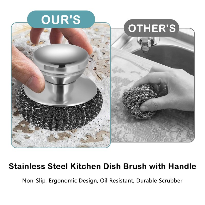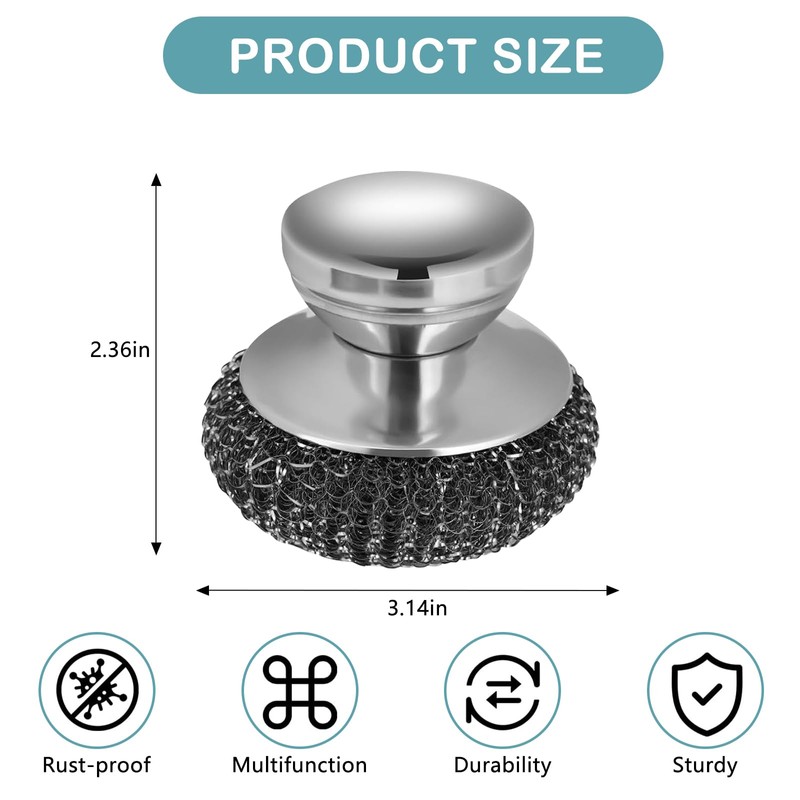 • 【Ergonomic Design】Designed to fit the human hand perfectly, the unique and exquisite handle ensures easy use, without the greasiness of ordinary scrubbers. The stainless steel scrubber handle also prevents direct contact with stains and detergents, effectively protecting hands.