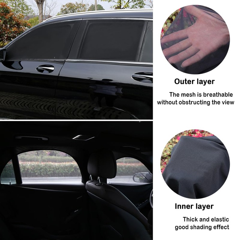 - đ Protection of Privacy - Our car window shades are made of thickened black cloth on the inside, which is impervious to light and can effectively block the view of the car, protect the passenger's privacy and avoid passers-by from prying eyes, it is a must-have car shades for you when you need privacy in your car for sleeping, working, camping and so on.