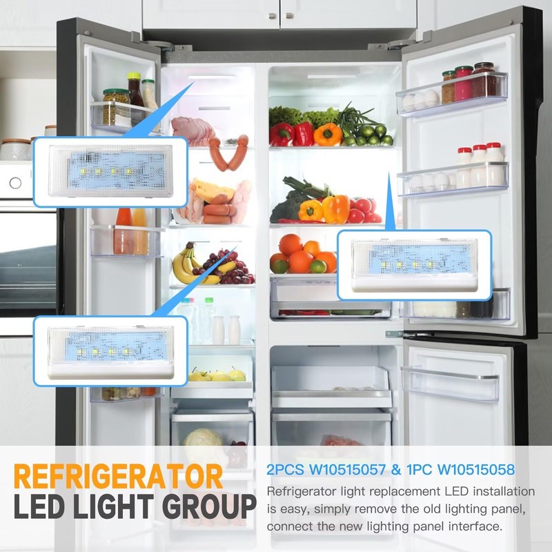 - Product Overview: 1 x W10515058 is the main ceiling LED light; 2 x W10515057 is the auxiliary LED light on the rear panel. One is located in the back panel cooler side, the other one is located in the freezer side. The replacement LED for the refrigerator light is made of high quality plastic material, it is moisture-proof and waterproof