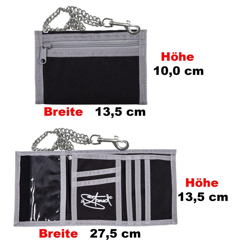 - Wallet. Width: approx. 14 cm. Height: approx. 10 cm. Chain length: approx. 56 cm, Material Cordurastyle, chrome-plated chain and carabiner with spring clasp.