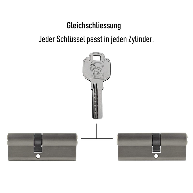 Security lock for indoor and outdoor doors. Product type: profile cylinder / double cylinder. Weight: 248 g (per cylinder, including screw, key and packaging). Material: coated brass. Size: 30 x 40 (30/40; A30-B40; 25-10-35). Length: 70 mm. Key: reversible key / dimple key. Locking pins: 5 - Areas of use: Interior and exterior doors – Brand: Löwen Sicherheit – Door type: front door/intermediate door/side entrance door/house entrance door – Functions: simultaneous locking – Rustproof – Box contents: 2 x simultaneous locking profile cylinders 70 mm 30/40 – 10 x reversible key / dimple key – 2 x mounting screws 80 mm M5 – instructions for the buyer – Simultaneous locking Reessessessessess: in each cylinder. For multiple orders, different sets are always sent. Larger sets and combinations can also be found in our shop. This offer cannot be combined with other offers. You can also create your own locking system as desired via our "locking system as desired". If you can't find the right one, please ask us. Please look for many other items in our shop. If you have any questions, please contact us at any time - your wobbele24 team