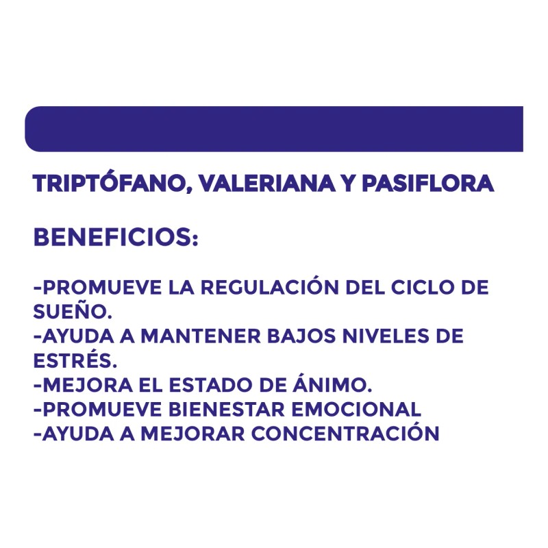 2x Suplemento Natural Relajante combina Triptófano, Valeriana y Pasiflora para promover la relajación, reducir el estrés y mejorar la calidad del sueño. Ayuda a conciliar el sueño y disminuir la ansiedad de forma natural.