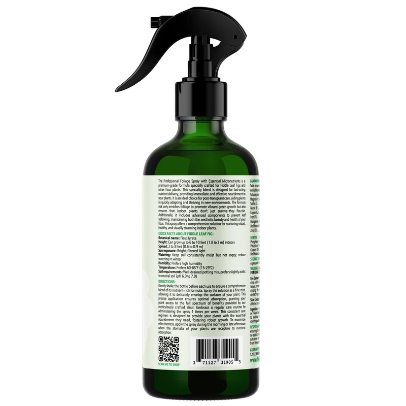 Elevate the health and beauty of your Fiddle Leaf Fig with our specially designed liquid fertilizer spray, perfect for this humidity-loving plant. Understanding the unique needs of Ficus lyrata, our spray not only nourishes but also maintains the ideal moisture level for the leaves, crucial for its well-being. This innovative formula offers dual benefits – it provides essential nutrients directly to the foliage while ensuring that the roots are not overwhelmed by excess water. Our fertilizer spray is expertly blended to prevent common issues such as leaf drop, a frequent challenge for Fiddle Leaf Fig owners. The fine mist of our spray envelops each leaf, offering a balanced mix of nutrients that promotes lush, vibrant foliage and supports overall plant health. This approach is particularly beneficial for Fiddle Leaf Figs, which thrive in humid environments and require regular leaf hydration for optimal growth. Easy and convenient to use, our product is an essential tool for both seasoned Fiddle Leaf Fig enthusiasts and those new to caring for this majestic plant. It seamlessly integrates into your plant care routine, providing a quick yet effective way to feed your Fiddle Leaf Fig and maintain the perfect level of humidity. Witness the transformation of your Fiddle Leaf Fig as our fertilizer spray boosts its growth and vitality. Not just a nutrient provider, it's a protective measure against common issues like leaf wilting, yellowing, and browning tips. Choose our fertilizer spray for a harmonious balance of nutrition and hydration, ensuring your Fiddle Leaf Fig remains a stunning, green centerpiece in your home or office. Embrace our specialized Fiddle Leaf Fig fertilizer spray for a simple solution to the complex needs of this magnificent plant, helping you achieve a lush, thriving Fiddle Leaf Fig with minimal effort.