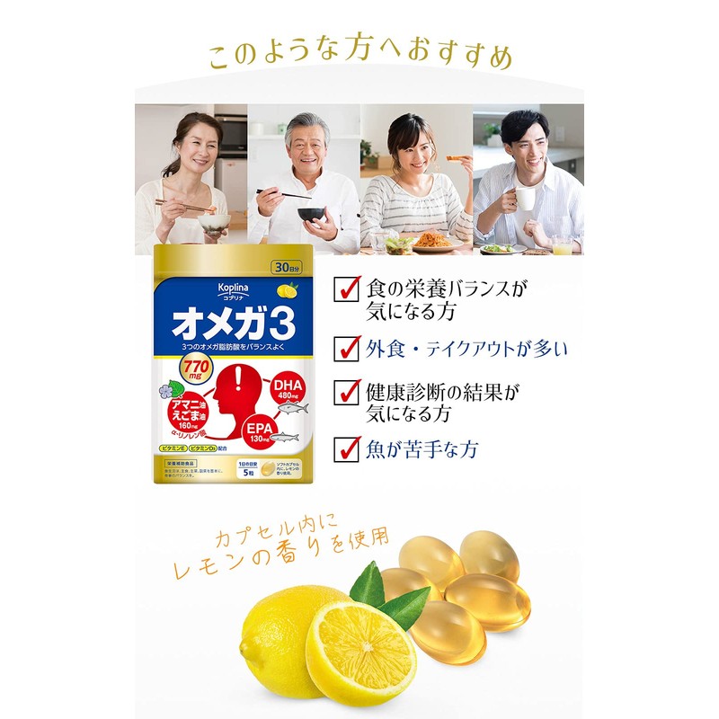 ・本商品は魚と植物(アマニ・えごま)のオメガ3を摂取できる商品です。カプセル内にレモン香料を使用しています。
