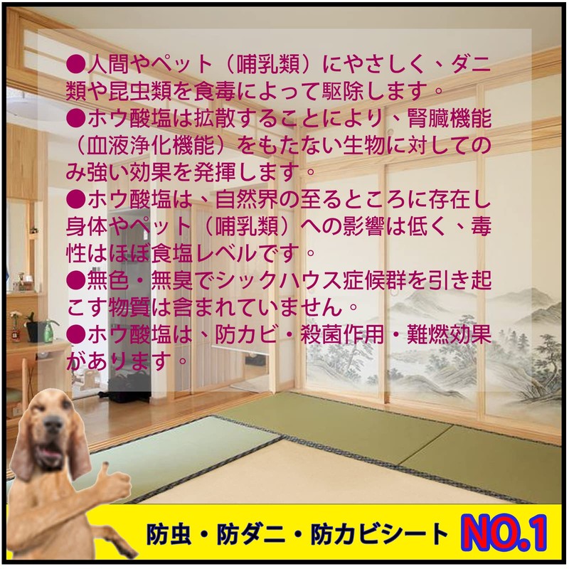 - 【有効成分】ホウ酸塩・ホウ素化合物(八ホウ酸二ナトリウム(DOT))・非揮発性。 防ダニ効果:食毒性(効果発揮まで14~20日)。 防カビ効果:殺菌作用(全てのカビに対して効果があるわけではございません)。含浸量:5,000mg/㎡。