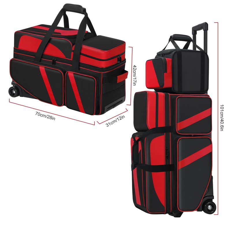 - 4 Ball Bowling Roller Bag with Wheels: The 4 ball bowling roller bag consists of a 3 ball bowling bag with wheels and a 1 ball bolor matching add on tote, which can store 4 bowling balls, and make a easy transport for 4 bowling balls. The 4 ball bowling roller bag is suitable for league play or practice