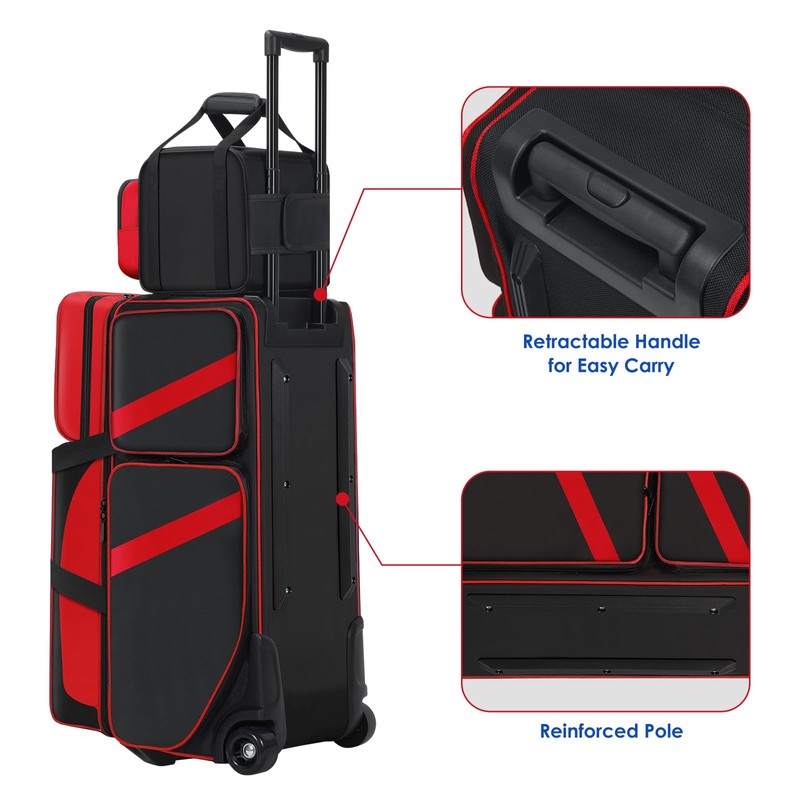 3 Ball Bowling Ball Bag with Wheels + 1 Ball Color Matching Add On Tote, 4 Ball Bowling Roller Bag with Multi-Pocket and Shoe Compartment, Rolling Bowling Bag with Retractable Handle for 4 Ball (Red)