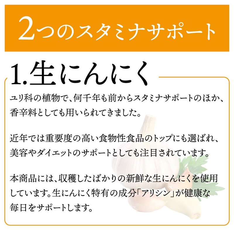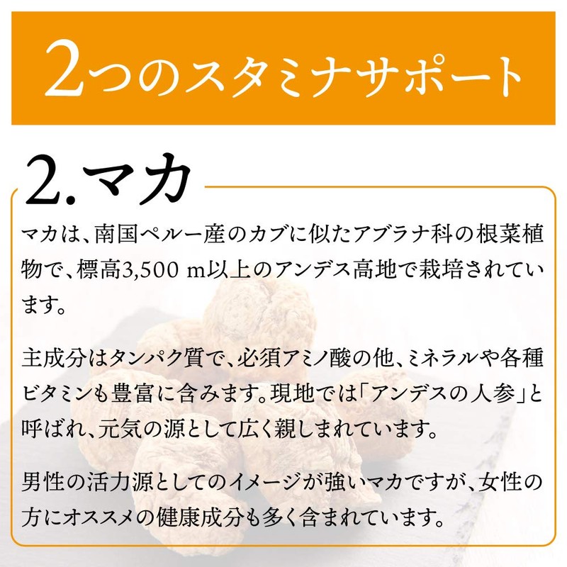 - マカはアミノ酸の一種であるアルギニンをはじめ、各種ビタミン、ミネラルなど豊富な栄養素を含んでいます。さらに、アリシンやビタミンB1が豊富なにんにくをプラスしました。家事や仕事、遊びも頑張りたいパワフルな毎日を応援します。