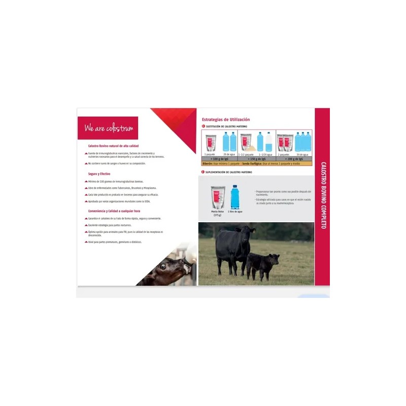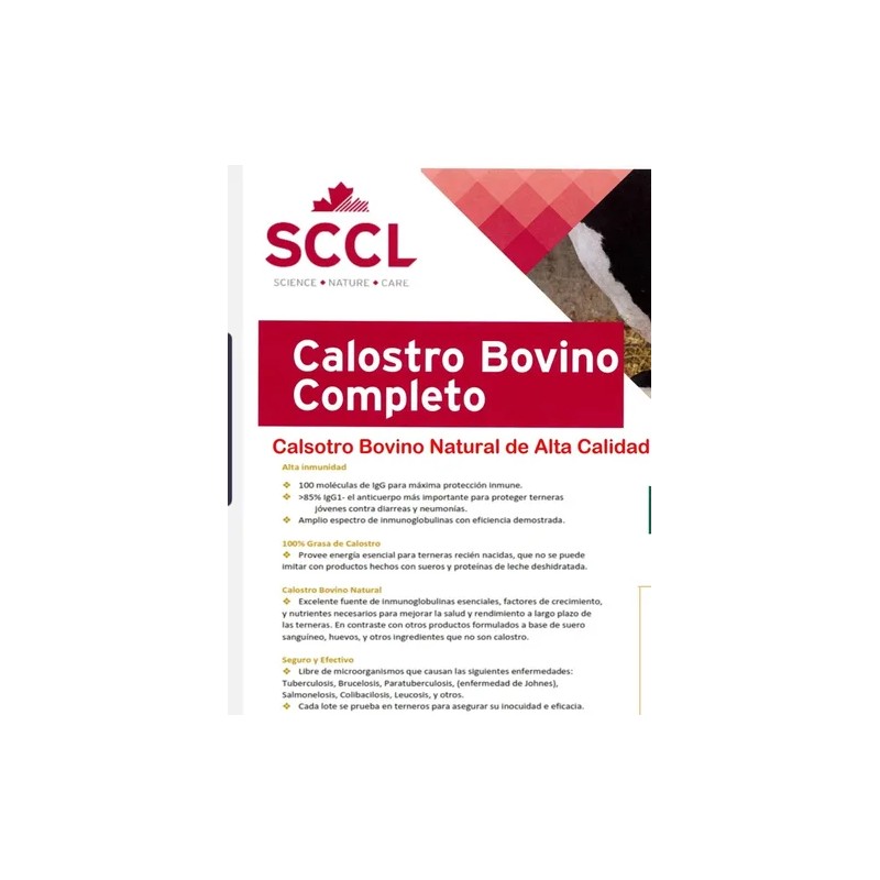 El Calostro Bovino Completo Natural SCCL en presentación de 3 bolsas está diseñado para cubrir las necesidades nutricionales críticas de los becerros recién nacidos. Cada dosis contiene proteínas, globulina bovina y factores de crecimiento que fortalecen el sistema inmunológico, ayudando a prevenir la falla de transferencia pasiva y garantizando un desarrollo saludable desde el primer día.