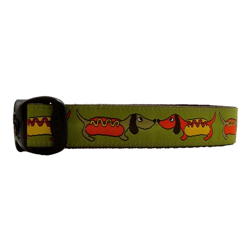 3 Dirty Dawgz Adjustable 3/4" and 1" Hot Dog Weiner Dachshund Dog Collars for Medium Large and X-Large Dogs (Small (3/4" W, 11"-15" L), Green)