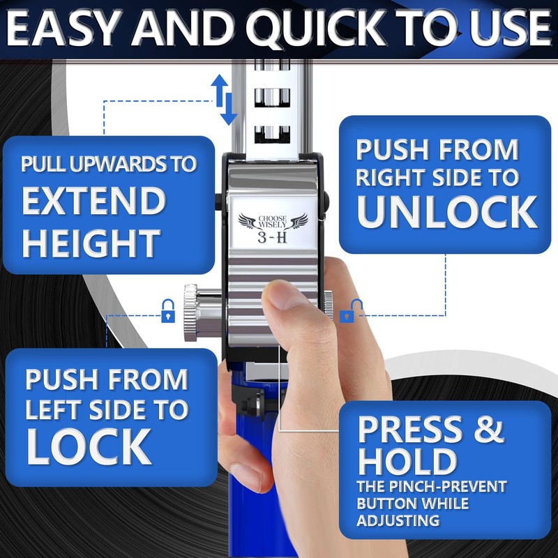 - UPGRADE SAFETY ADJUSTMENT LATCH: we are using the push-lock and unlock button to adjust the height of arm jack instead of using the Spring-loaded pins that pop out into holes in the outer hand lifting jack tool for installing upper cabinets because of the ball joints at each end that have to flex and rotate for varying angles made it easy for the ball to loose. we are using the combination of notch and screw adjustment allow for perfect adjustment and very sturdy.