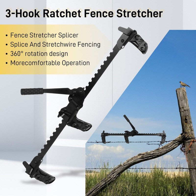 3-Hook Ratchet Fence Stretcher,Heavy Duty Steel All-Purpose Splicer with Ratchet Design,All Purpose Fence Stretcher Splicer for Barbed & Smooth Wire,Fence Barb Wire Repair Tool,Black