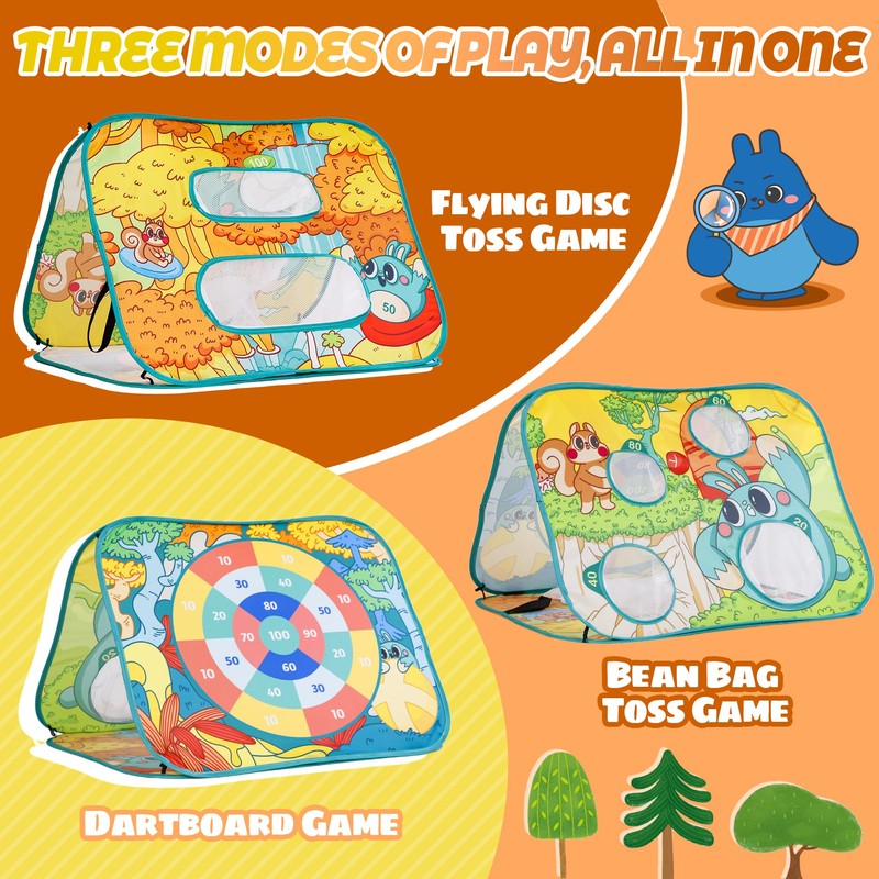 · 3-in-1 Game Board: Combines Disc Toss, Cornhole Toss, and Dartboard for multiple gameplay options.