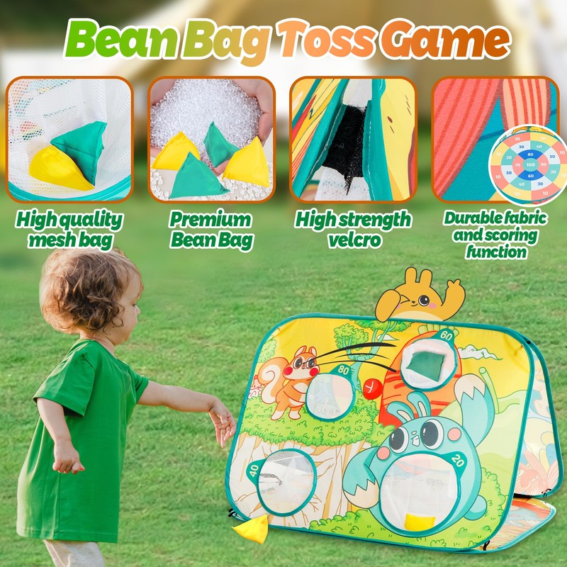 - Safe & Durable: Made from high-quality, thick fabric with reinforced edges and durable metal wire, this toy set is built to last. The bean bags are filled with non-toxic PVC material, preventing powder leaks and ensuring a safe play experience. Compact and sturdy, it's ideal for both indoor and outdoor use