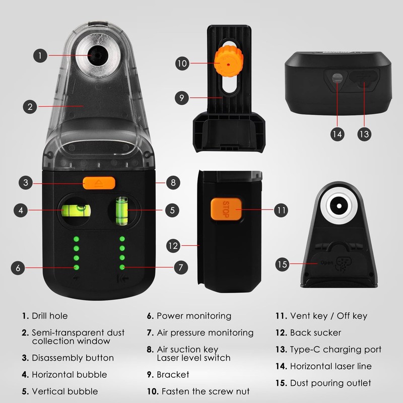 • 3-in-1 Multi-Function Tool: Combines a dust collector, laser level, and bracket in one convenient device, perfect for precise drilling and alignment.