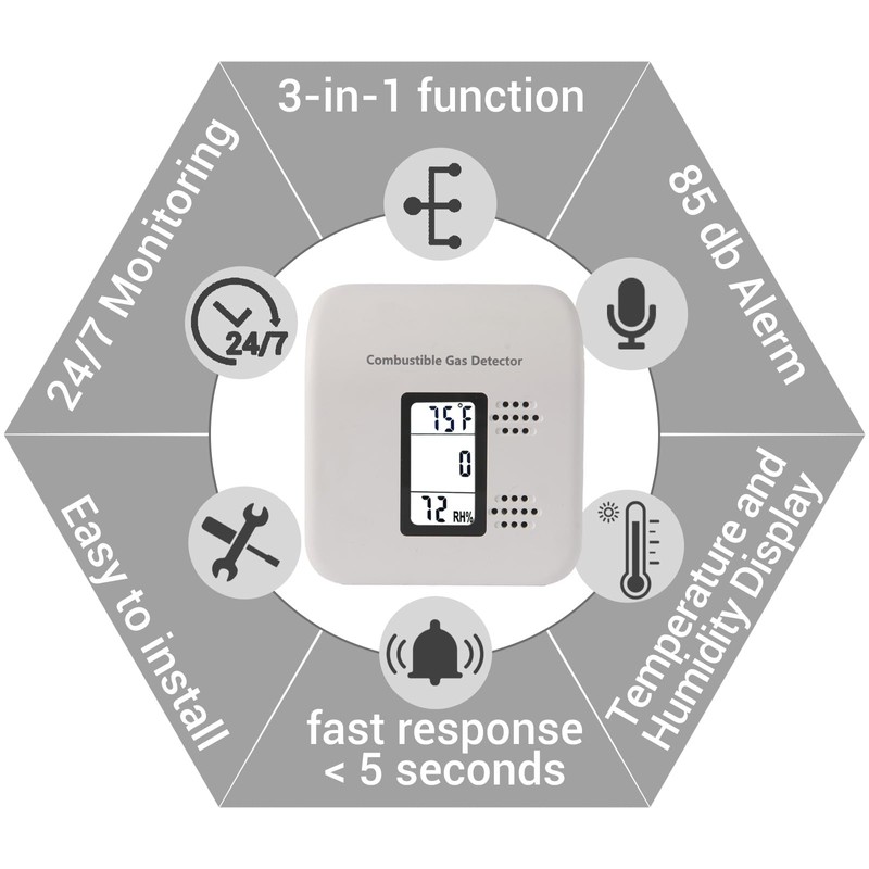 - 3-in-1 Combustible Gas Detector: Detects monitors explosive gases(natural gas & propane), while tracking real-time temperature and humidity on LED screen