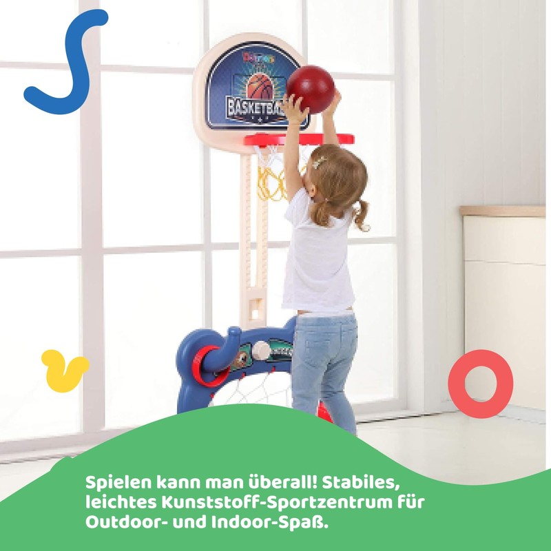 - 3-in-1 KID ACTIVITY CENTER: give your toddler a safe area in which to play, this kids sport center can be used to play basketball, soccer and ring toss games. Encourage your little one to stay active while improving their hand-eye coordination skills, aim and practice their slamming, kicking and hooking skills. The playset comes with 1 basketball,1 soccer ball, 4 rings, and 1 inflator.
