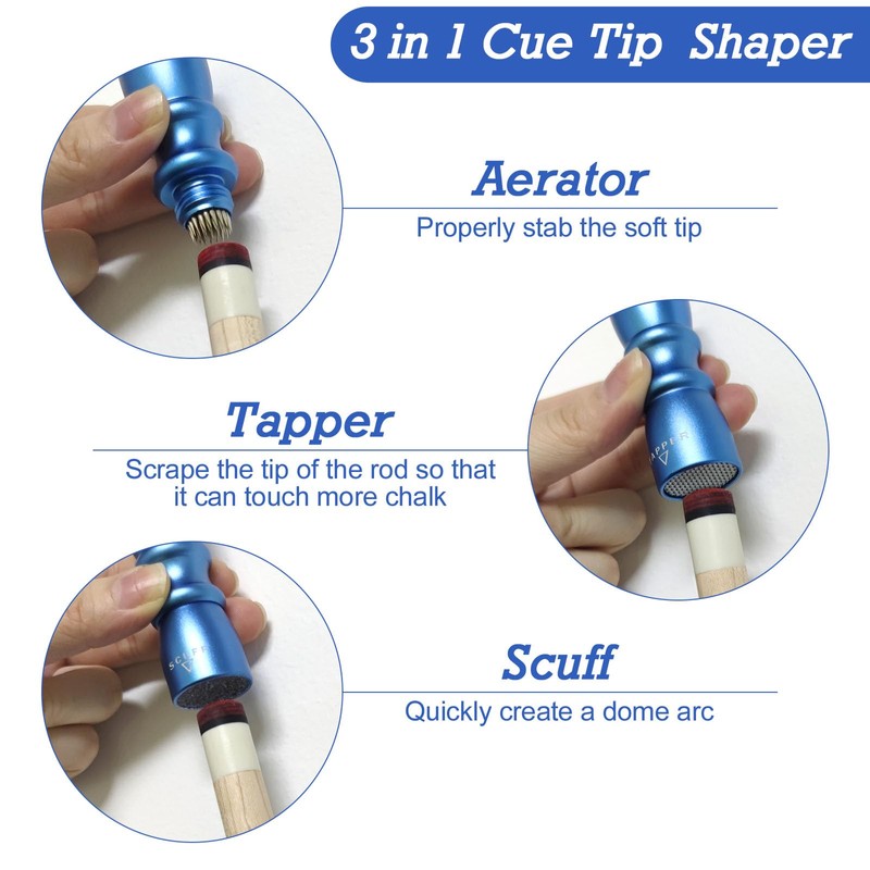 - 【Effortless Precision】 The Taper prepares the tip surface for chalk adherence, the Scuffer contours it to your desired dome curvature,and the Aerator enhances chalk retention, allowing for consistent and accurate shots every time.