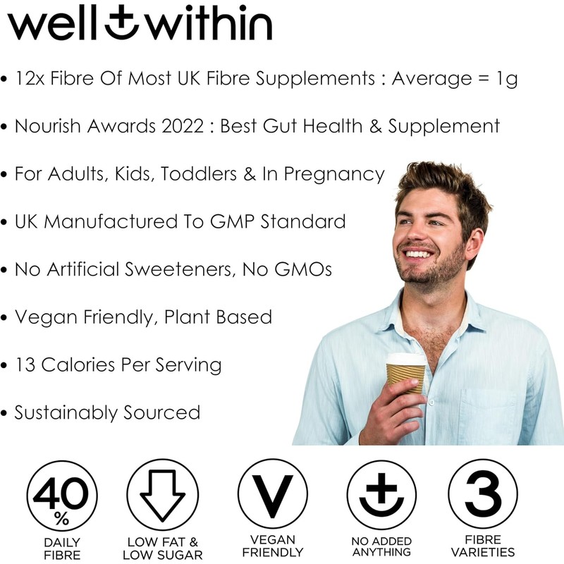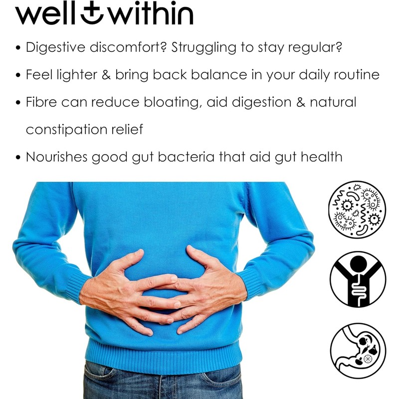 Boost your gut health with our 3-in-1 Prebiotic Fibre Supplement, combining 12g of soluble fibre from Inulin, Acacia Fibre, and FOS (Fructooligosaccharides) in every serving. This unique blend provides 40% of your NHS recommended daily fibre intake (30g), supporting digestive wellness and nourishing your gut microbiome. Designed for easy incorporation into your daily routine, it dissolves effortlessly in hot or cold drinks—be it tea, coffee, smoothies, or shakes. This gentle, natural formula helps with digestion, alleviates bloating, and provides constipation relief, leaving you feeling lighter and more balanced. Free from artificial additives, it’s a wholesome, low-calorie, low-sugar option for individuals of all ages, including pregnant women.
