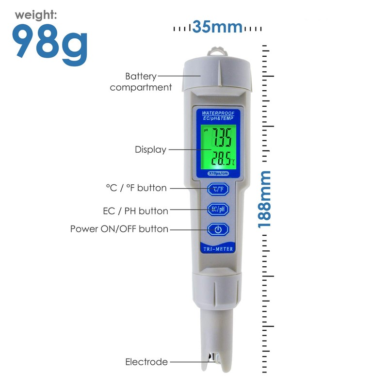 3-in-1 Water quality testing tool PH/EC/TEMP measurement in one unit.