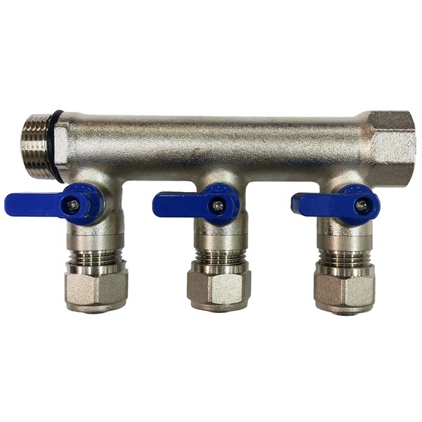 3 Loop Plumbing Manifold w/ 3/4" trunk & 1/2" pex ball valves, blue handle