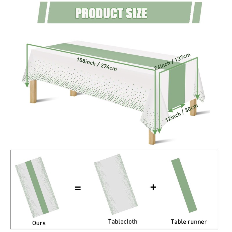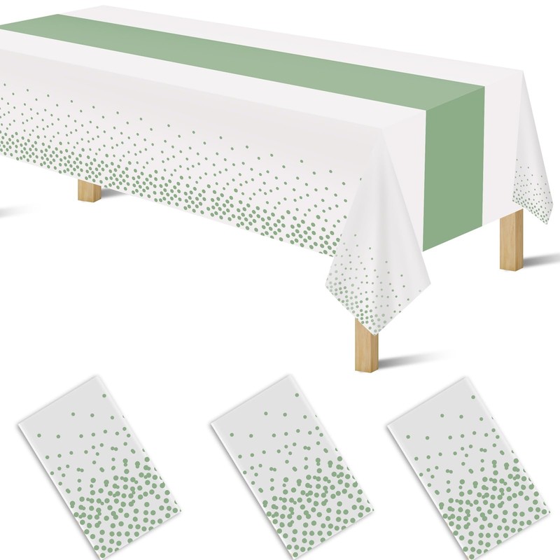 3 Pack 2in1 Disposable Plastic Tablecloths 54" x 108" White and Sage Green Dot Party Table Cloth Rectangle Table Cover for Wedding Birthday Baby Shower Anniversary Christmas New Year Party Decorations