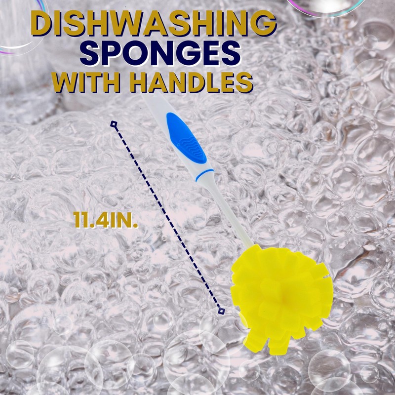 - đź§Ľ COMFORTABLE HANDLE FOR A BETTER CLEANING GRIP: Each sponge is attached to a lightweight, non-slip handle that fits comfortably in your hand. The extended length allows you to clean deep containers and tall glasses without getting your hands wet or soapy.