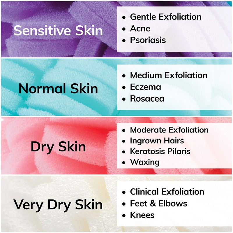 - The ViaBuff Exfoliating Buffs come in 4 strengths for every skin type: Purple – Sensitive Skin ; Green – Normal Skin ; Pink – Dry Skin ; White – Very Dry Skin