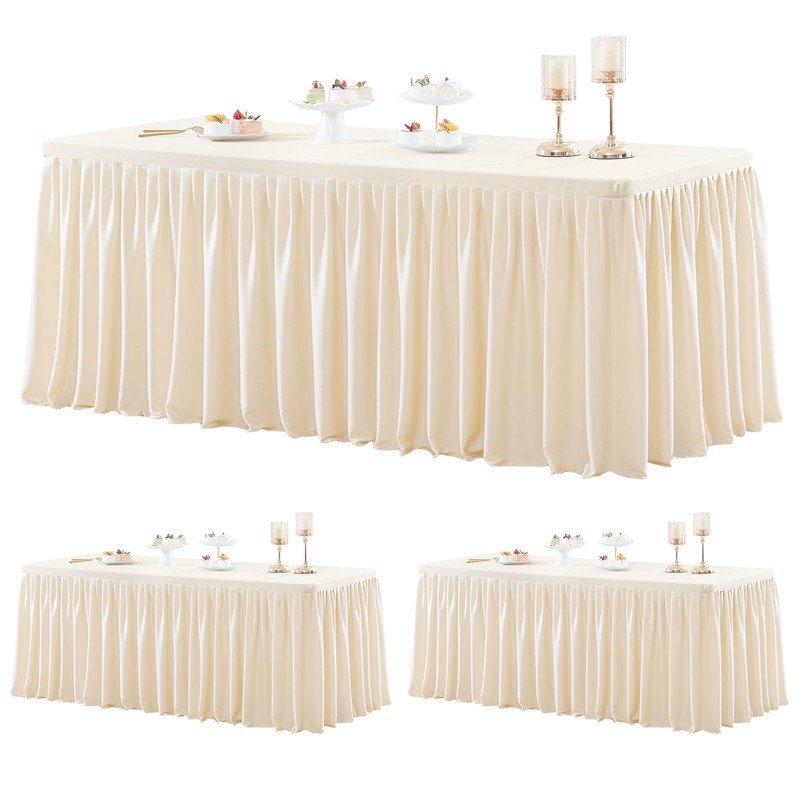 - Outstanding Pleated Tablecloth: This ivory table clothes are designed with customized pleats, great for table dressing, make your table more professional and elegant, and adding a touch of simplistic beauty. The ivory table cover and skirt will turn a plain plastic folding table into a lovely buffet table. 6ft ivory table covers with table skirts is suitable for 6 foot rectangle tables (72 L x 30 W x 30 H)