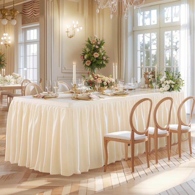 - Material of 6 ft table cloth: This ivory 6ft rectangle tablecloth is made of wrinkle free and quality polyester fabric, the pleated bottom gives the table a clean and flawless look and hides the table legs. Stays firmly in place and doesn't move much, even during usage or windy weather