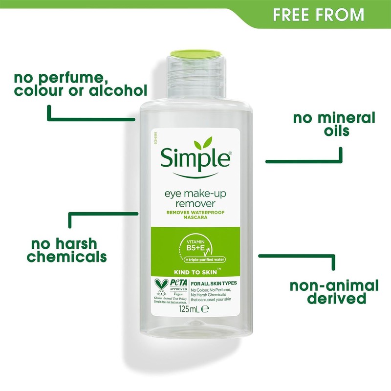 - Simple Kind To Skin Eye Make-up Remover is PETA certified cruelty-free and vegan. Globally, Simple does not test on animals