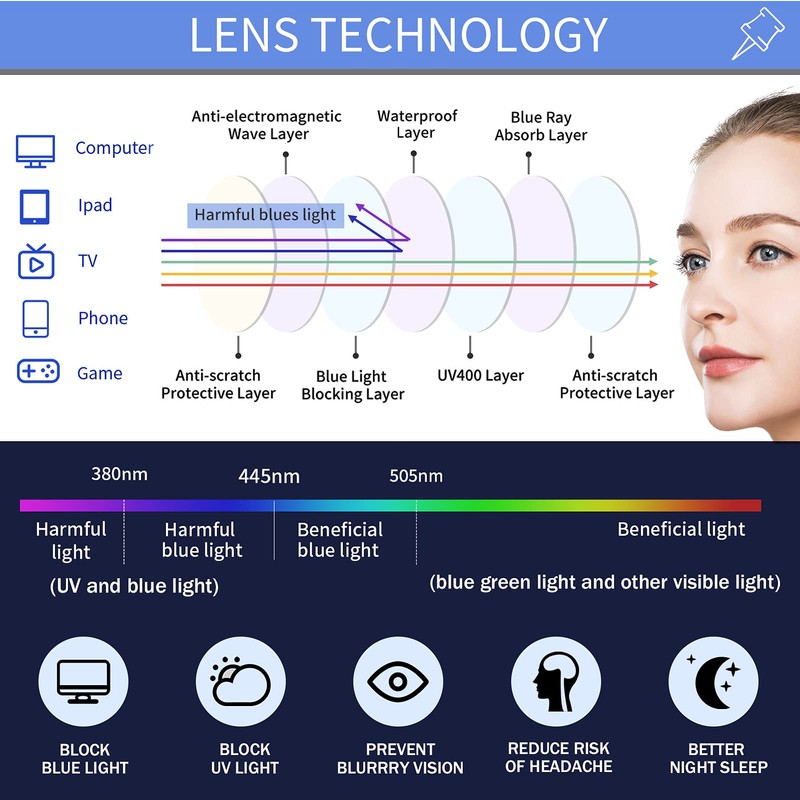- 💎【Anti-Blue Light High Definition Lenses】 Blue light blocker lens with UV400 protection, anti-glare and reduce eye strain & discomfort caused from a long time reading, using computer phones, laptop, no more worry about eye fatigue and headache.