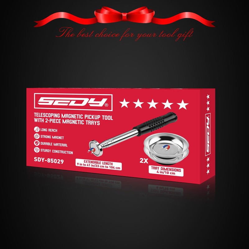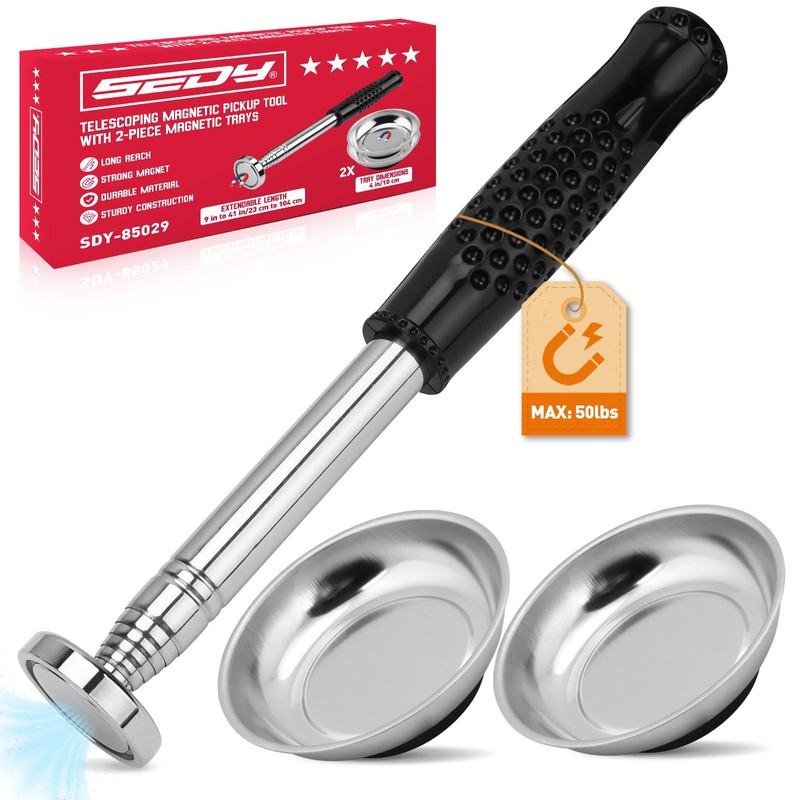 This 3 Pack Telescoping Magnetic Pickup Tool Set is the ultimate solution for picking up metal debris effortlessly. With a powerful 50lb pull force, extendable up to 41 inches, and ergonomic non-slip grips, it ensures superior comfort and efficiency. Ideal for mechanics, DIY enthusiasts, and professionals, this versatile tool set is perfect for retrieving nails, screws, and other metal objects. It also includes 2pcs magnetic 4 inch tray for easy part storage, making it a must-have for any toolkit.