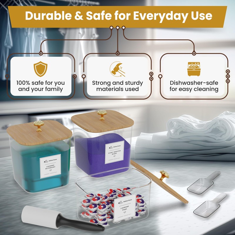 - SEE CONTENTS CLEARLY and know precisely when to restock, thanks to the transparent acrylic material of this laundry powder container. The strong design of our laundry jars for detergent ensures they stay reliable for years without breaking down