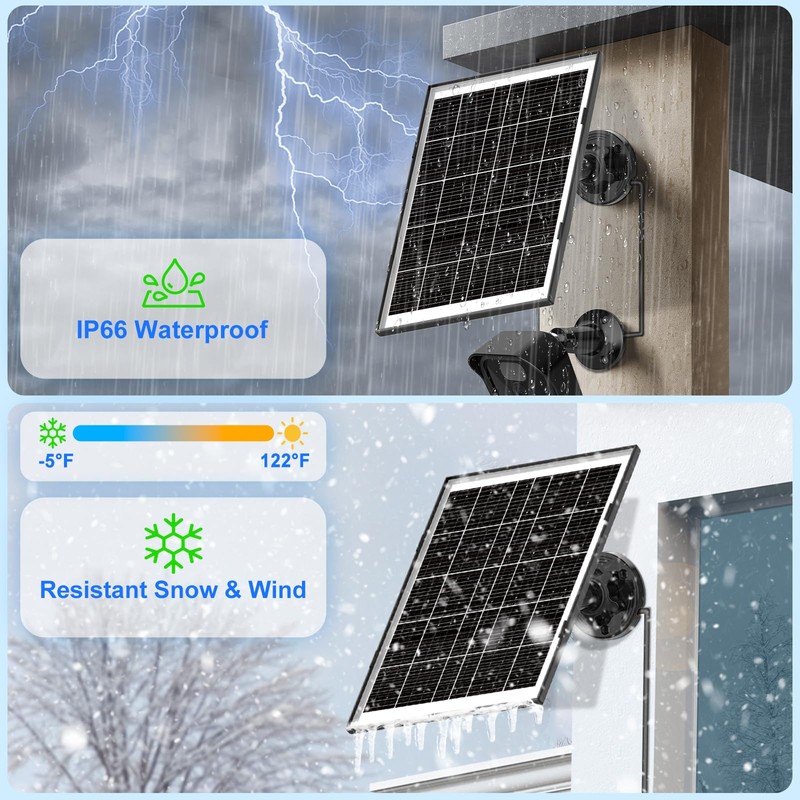 - 【All-Weather Durability】This security camera solar panel achieves a strong IP65 waterproof rating, with an operating temperature range of -5°F to +125°F, even in extreme rain, snowstorms and storms, this solar panel for camera can easily withstand them, providing a stable power supply and all-weather durability.