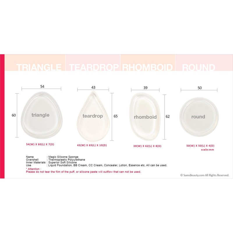 * Easy To-Use This Magic Silicone Sponge has soft and smooth silicone texture and easy to apply your cream or liquid product. * Perfect for people who do not want to messy their fingers during makeup. * Easy To Clean-Magic Silicone Sponge is very easy to keep clean. * All you need to clean this product is soap and warm water. * Also, use a wet/dry towel or tissues to clean this silicone sponge temporarily during traveling but don’t forget to wash it later when you get home. * Save-While other sponge applicators absorb the large amounts of product, this Magic Silicone Sponge will reduce wasted makeup. * No more wasting products! Save Money! Caution-For external use only. Avoid direct sunlight. * Replace to new sponge when product is damaged or cracked in outer lining. Keep out of reach of children and pets.