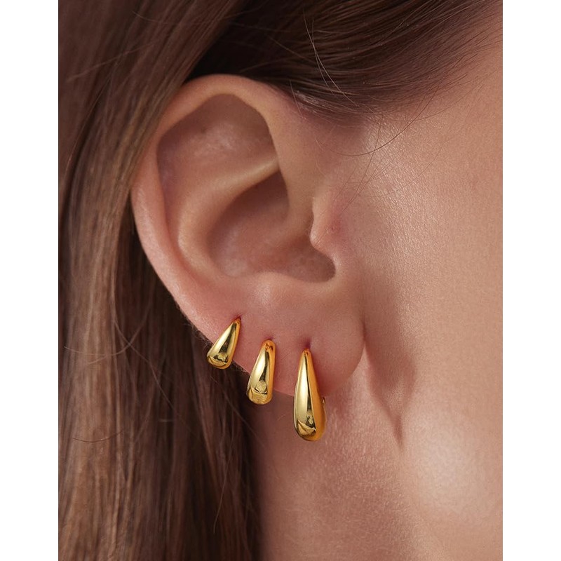 3 Pairs 14K Gold Plated Huggie Hoop Earrings for Women Hypoallergenic Lightweight Small Chunky Hoops for Sensitive Ears, Multiple Piercing Jewelry Set, Trendy Stackable Everyday Earrings Gift (4-Drop)