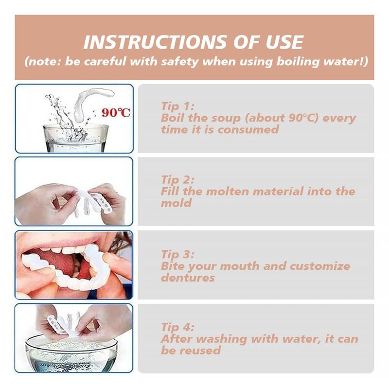 - 【Use Instruction】: Soak the gutta percha in hot water first, it will dissolve and soften when exposed to hot water, then put it into the dentures, place the dentures on your teeth, finally adjust it to your comfortable position.You can refer to the steps of using the picture