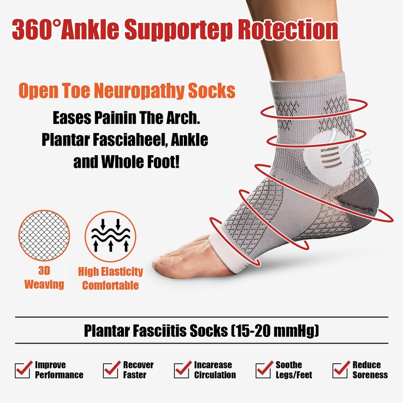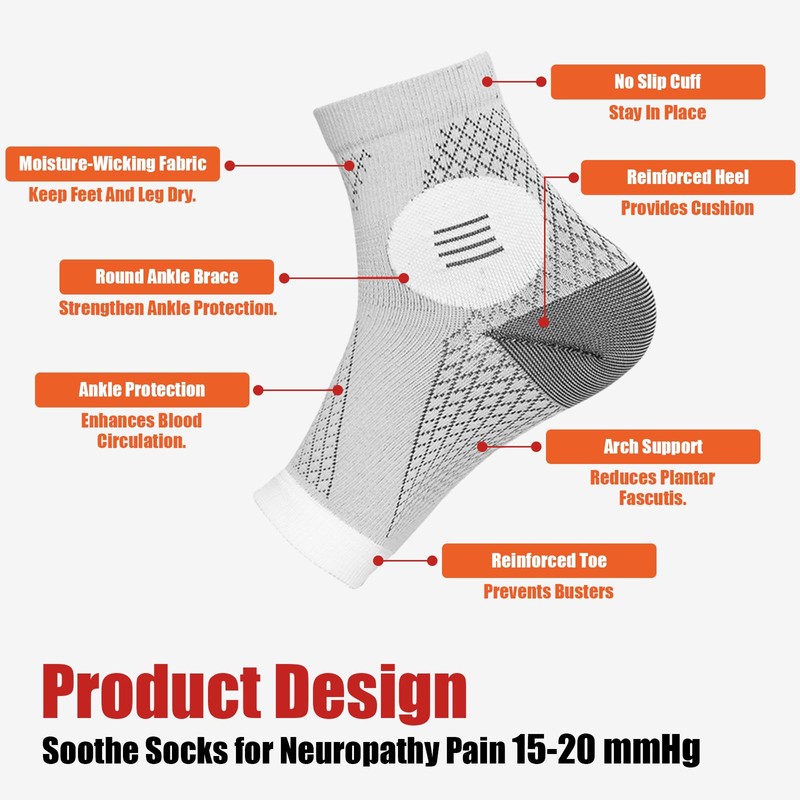 - Acelera la recuperación: calma los calcetines aceleran el proceso de curación de neuropatía, tendinitis, fascitis plantar o dolor de pie diabético, etc. Los calcetines de neuropatía de los dedos abiertos aumentan eficazmente la circulación del flujo sanguíneo y disminuyen la hinchazón dolorosa a lo largo del pie. Los calcetines de compresión de fascitis plantar optimizan el proceso de curación del cuerpo.