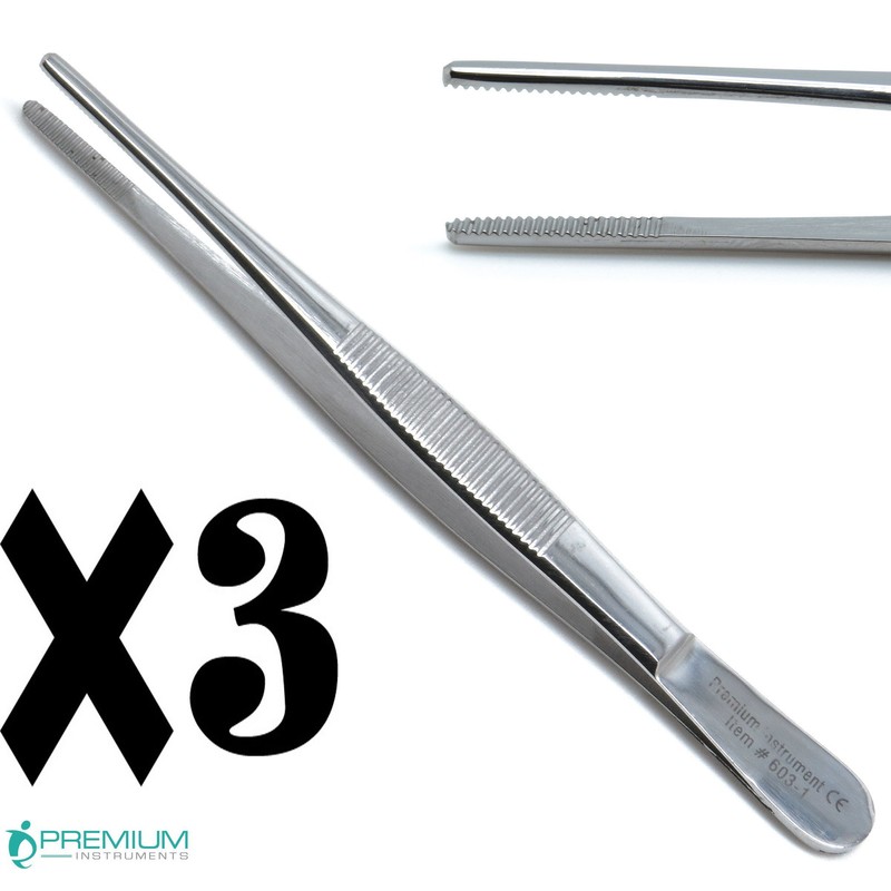 3 Pieces of Dressing Tweezers: Tissue forceps/pliers used to grasp and stabilize soft tissue during suturing. Thumb forceps with serrated tips for increased grip. This tool is used primarily to secure tissue without the worry of slippage. In oral surgery, Adson tissue forceps are used to grasp loose, excised tissue as well as to manage placement of oral tissue while it is being sutured. Serrated forceps are used on tissue; counter-intuitively, teeth will damage tissue less than a smooth surface because one can grasp with less overall pressure. Smooth or cross-hatched forceps are used to move dressings, remove sutures and similar task.