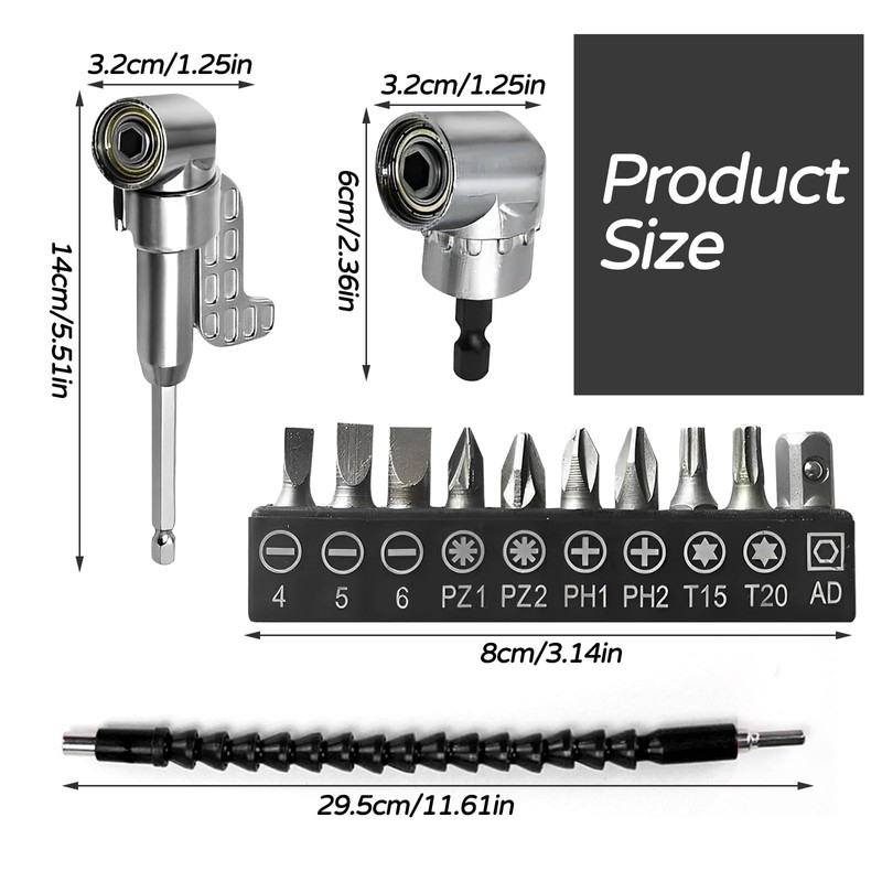 - 【Package Includes】2 pcs right angle drill attachment (1 long and 1 short bit) + Flexible Extension Bar and 10 pcs Screwdrivers are the perfect handy tools for hard to reach work areas.